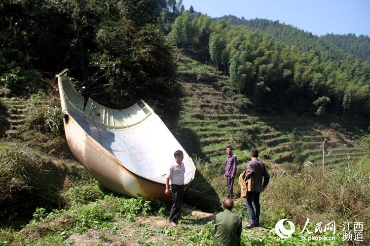 當(dāng)天早上7時許,遂川縣湯湖鎮(zhèn)園溪村農(nóng)民曾俊科給當(dāng)?shù)卣块T打電話,發(fā)現(xiàn)該家前面幾百米處山中發(fā)現(xiàn)衛(wèi)星整流罩殘骸。據(jù)當(dāng)?shù)卮迕窠榻B,大約凌晨00時30分之后聽到兩聲“轟”的巨響,當(dāng)時山上園溪村農(nóng)民曾俊科等幾戶人家周圍全部停電,7時許,曾俊科發(fā)現(xiàn)一塊整流罩殘骸躺在該村沙堆子坑小路上,另外一塊在搜尋中。被發(fā)現(xiàn)的衛(wèi)星整流罩殘骸呈半圓形狀,長約10.3米、半徑4.5米,由于落在深山加上沒有切割設(shè)備,整流罩暫時無法回收,當(dāng)?shù)匾褜⑶闆r向上級匯報,等待上級部門支援回收。