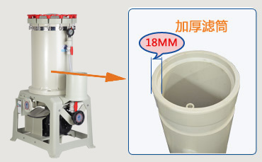 杰凱過濾機(jī)濾筒是采用PP材質(zhì)的加厚濾筒,不僅材質(zhì)好、耐腐蝕;而且濾桶桶壁更厚,同型號的電鍍過濾機(jī)耐壓能力提高了1-2公斤。用杰凱過濾機(jī)不用擔(dān)心因抗壓力差損壞過濾機(jī)。