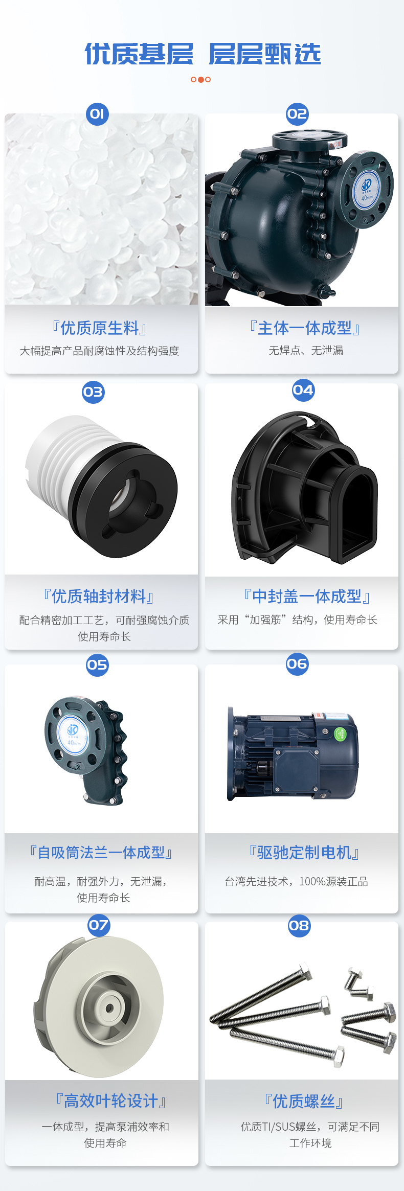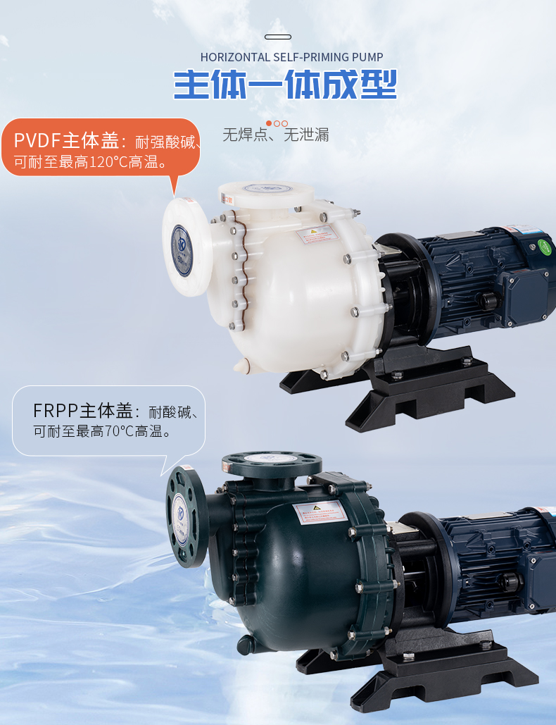 1、泵體采用優(yōu)質(zhì)原生料,大幅提高產(chǎn)品耐腐蝕性及結(jié)構(gòu)強(qiáng)度; 2、自吸筒與法蘭一體成型,無焊點,無泄漏; 3、中封蓋一體成型,采用強(qiáng)筋穩(wěn)固,使用壽命長; 4、高效葉輪設(shè)計,一體成型,提高泵浦效率和使用壽命; 5、軸封材質(zhì)可配合使用環(huán)境選擇不同材質(zhì)。