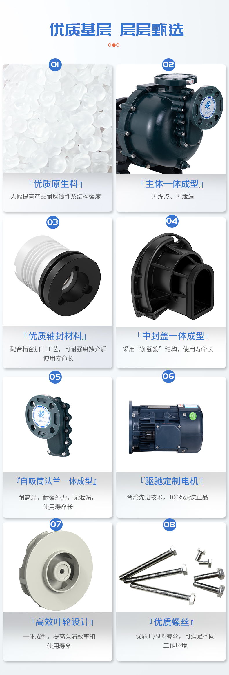 1、泵體采用優(yōu)質原生料,大幅提高產品耐腐蝕性及結構強度; 2、自吸筒與法蘭一體成型,無焊點,無泄漏; 3、中封蓋一體成型,采用強筋穩(wěn)固,使用壽命長; 4、高效葉輪設計,一體成型,提高泵浦效率和使用壽命; 5、軸封材質可配合使用環(huán)境選擇不同材質。