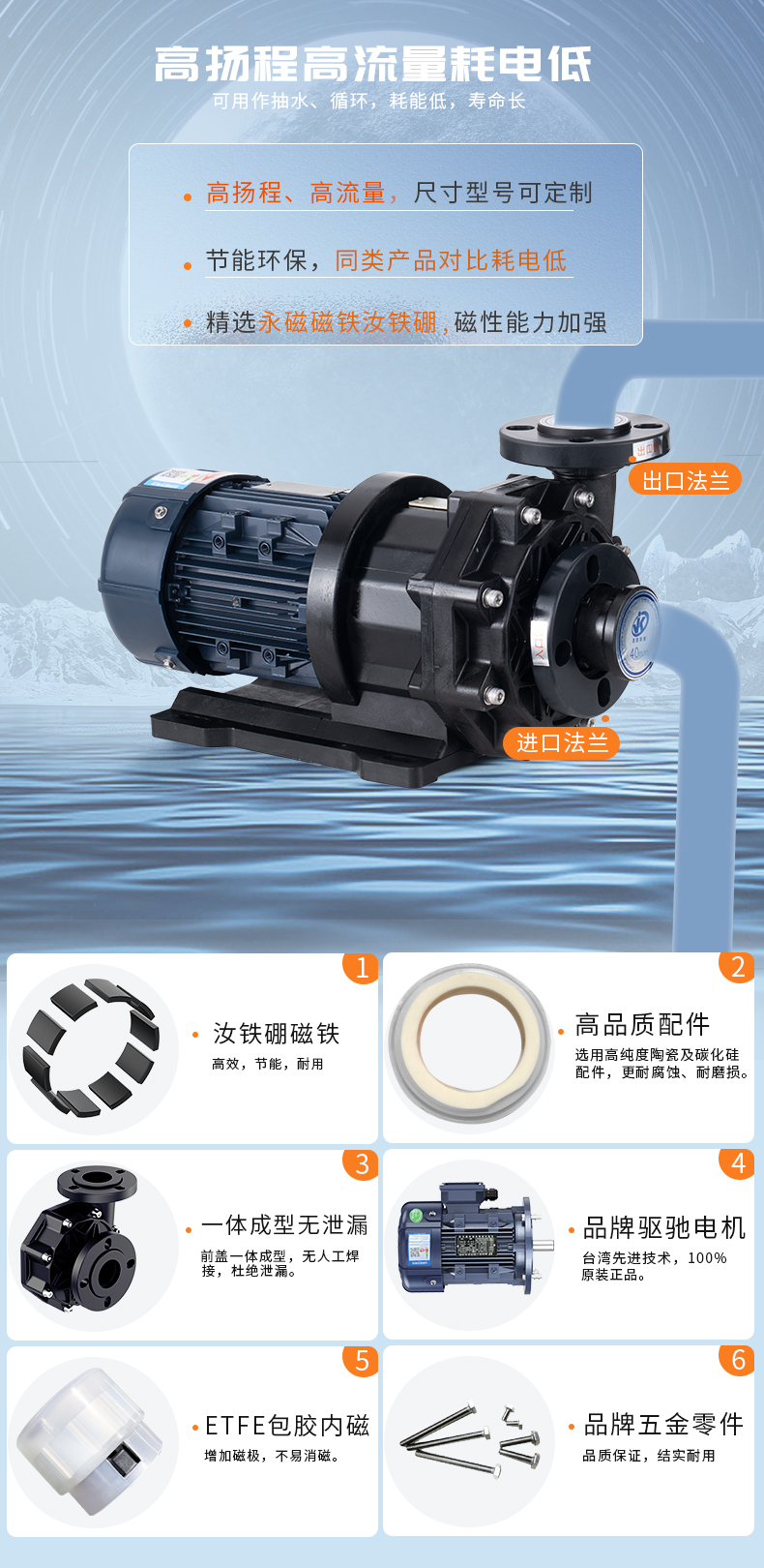 1、泵浦采用優(yōu)質(zhì)CFRPP/PVDF/ETFE原生材料; 2、高純度陶瓷及碳化硅軸承、軸芯; 3、耐腐蝕、耐磨損、耐熱沖擊; 4、超大流量,流量可達(dá)1100L/MIN; 適用于:蝕刻液、電鍍液、電泳液、污水提升、輸送、噴淋等。