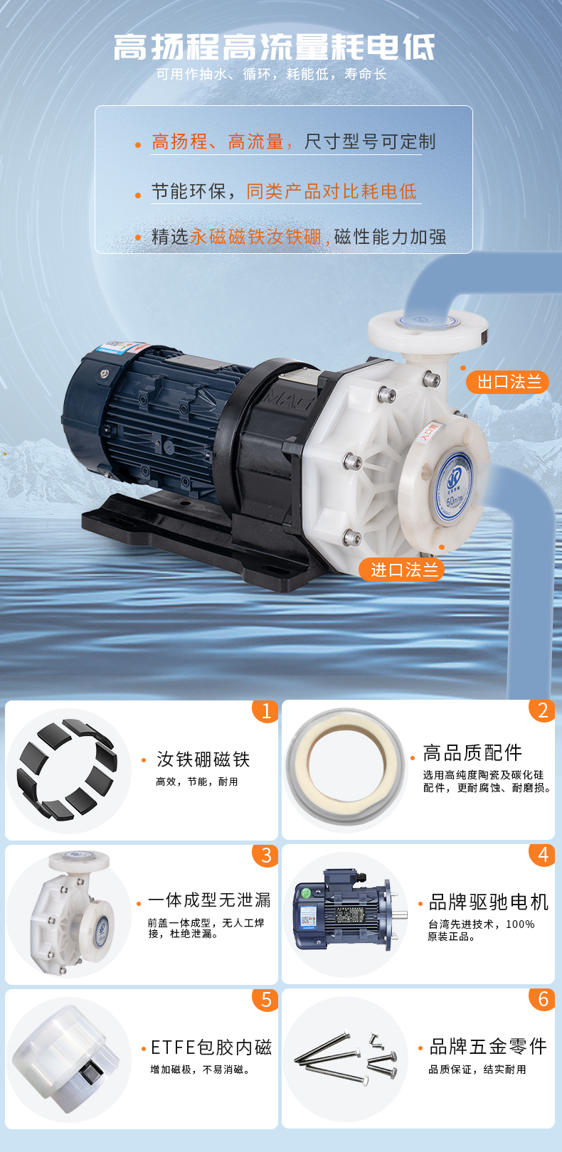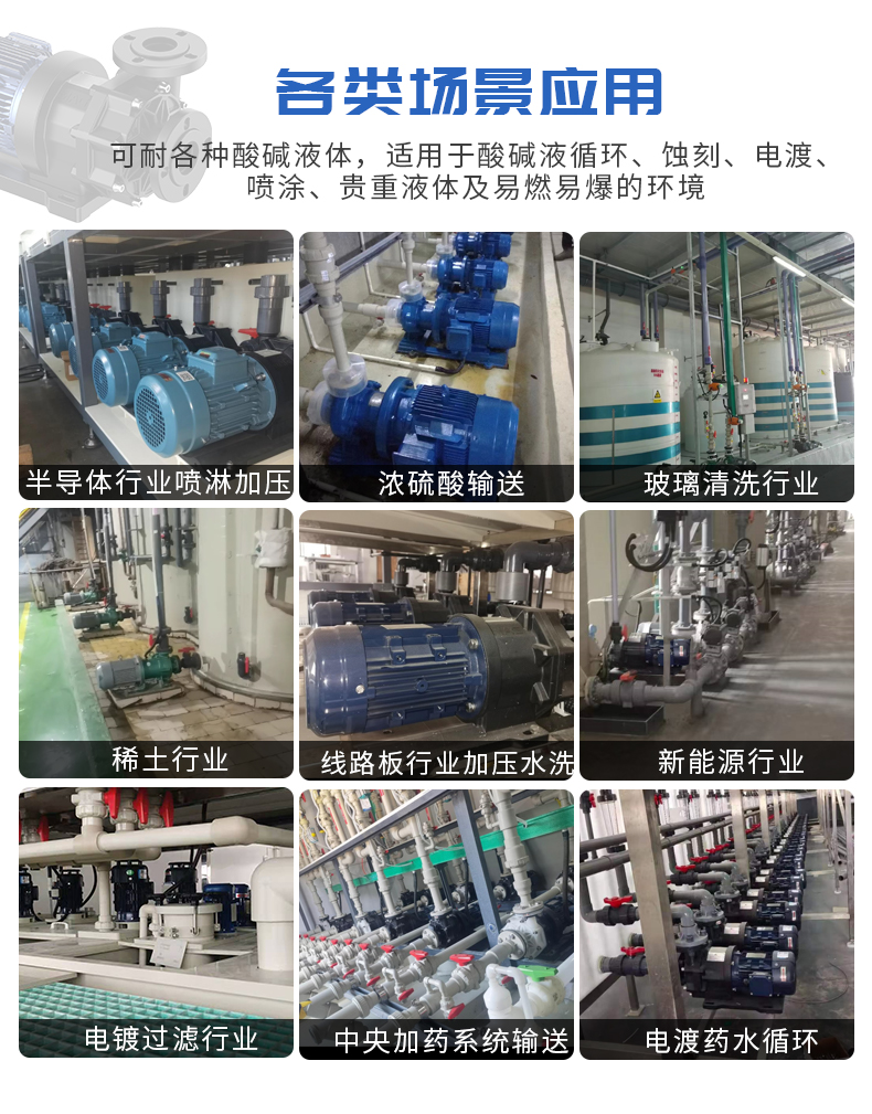 1、泵浦采用優(yōu)質(zhì)CFRPP/PVDF/ETFE原生材料; 2、高純度陶瓷及碳化硅軸承、軸芯; 3、耐腐蝕、耐磨損、耐熱沖擊; 4、超大流量,流量可達(dá)1100L/MIN; 適用于:蝕刻液、電鍍液、電泳液、污水提升、輸送、噴淋等。