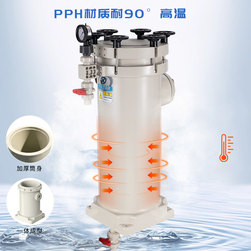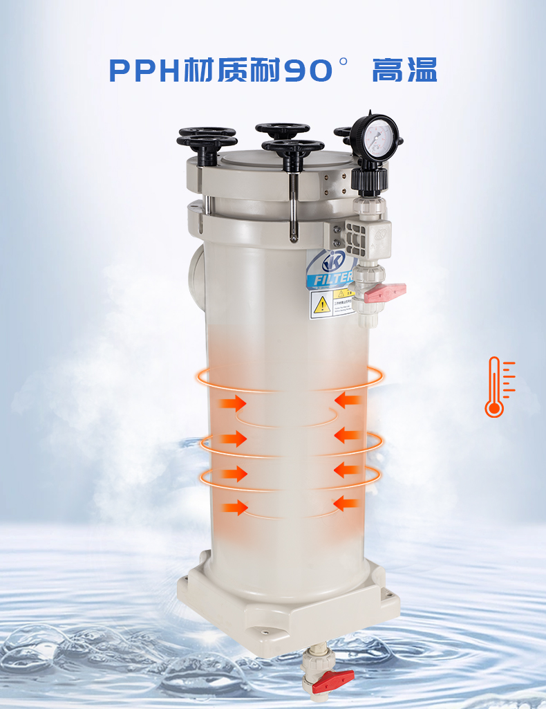 1、PPH/PVDF 原生材料,多種濾材可選; 2、桶身排氣,無金屬扣環(huán)+翻蓋設(shè)計(jì); 3、加厚桶一體成型設(shè)計(jì),整機(jī)無焊接點(diǎn),100%無泄漏,結(jié)實(shí)、安全。使用壽命可達(dá)8-10 年; 4、配套多種款式濾材,滿足市場多種需求; 5、廣泛用于酸堿藥水,電鍍藥水,蝕刻液,清洗液過濾。