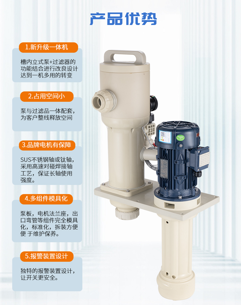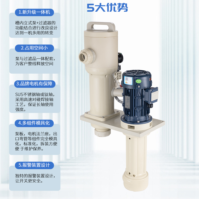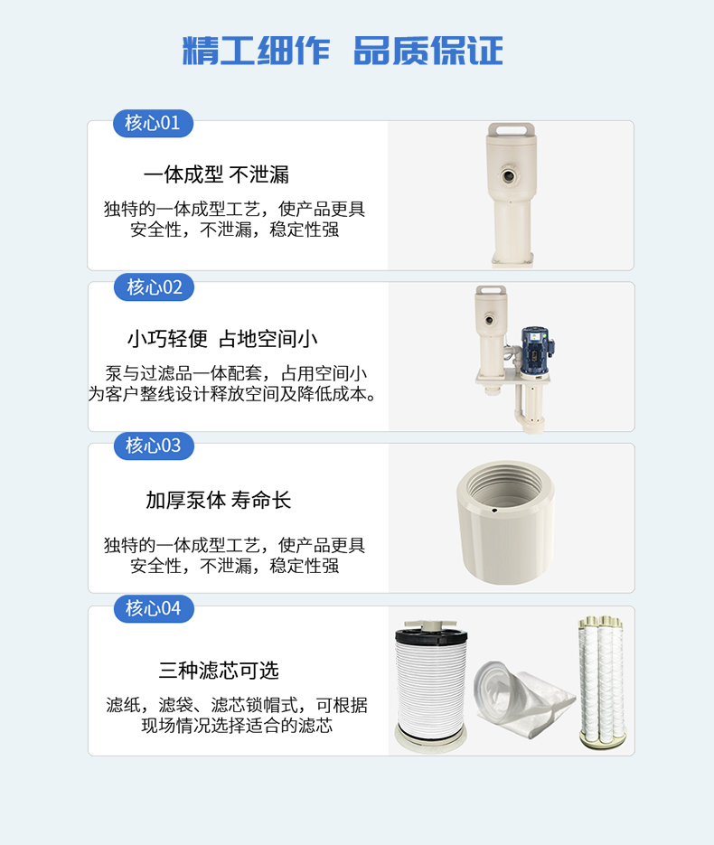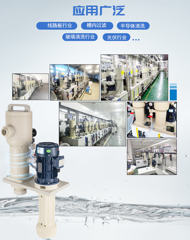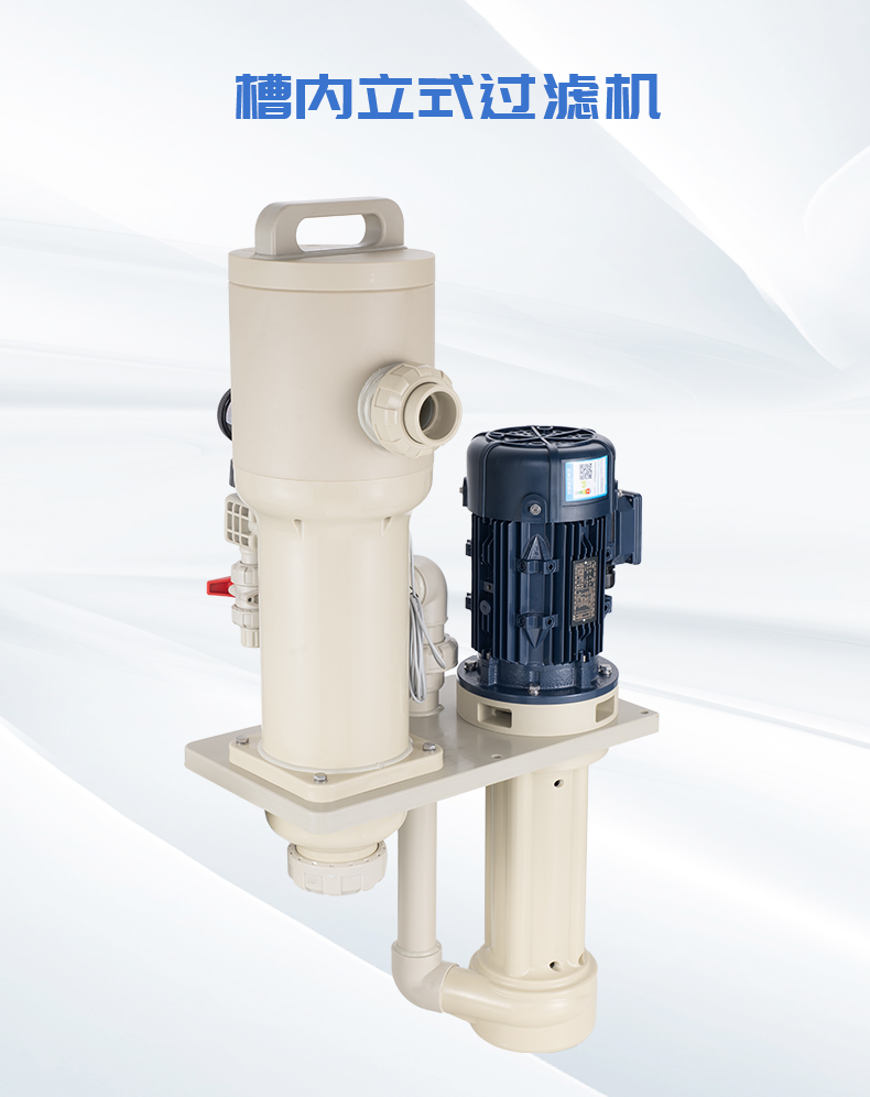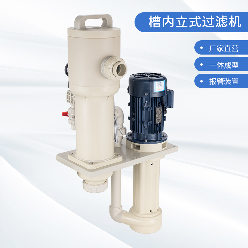 1、采用優(yōu)質(zhì)PPH/PVDF優(yōu)質(zhì)原材料,提升耐腐蝕能性及結(jié)構(gòu)強(qiáng)度; 2、泵與過濾器一體配套,緊湊,占用空間小,為客戶整線設(shè)計(jì)釋放空間及降低成本; 3、槽內(nèi)安裝,可配套濾芯,濾袋,網(wǎng)板多種方式,適用于噴淋、循環(huán)等制程; 4、更換濾芯快捷、省時(shí),省力; 5、獨(dú)特的報(bào)警裝置設(shè)計(jì),開蓋更安全。